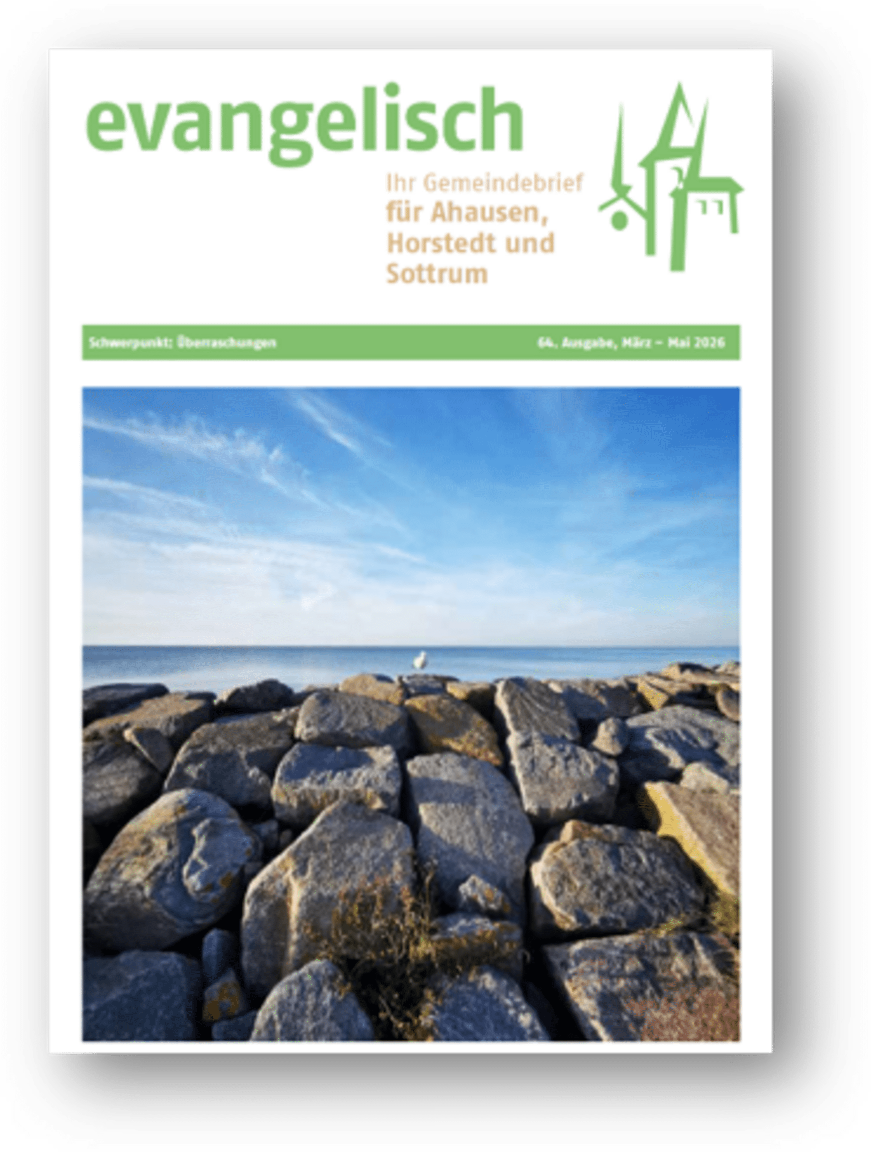 Der Gemeindebrief "evangelisch" der Region West (Ahausen - Horstedt - Sottrum) erscheint als dreimonatliches Magazin. Es berichtet über Aktuelles aus der Gemeindearbeit, informiert über Termine, Gottesdienste und vieles mehr.